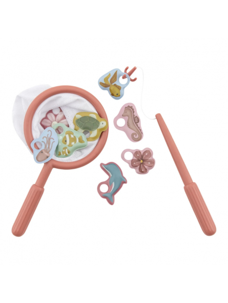 Il set include una canna da pesca, una rete di atterraggio e otto figure colorate, come fiori e creature marine.